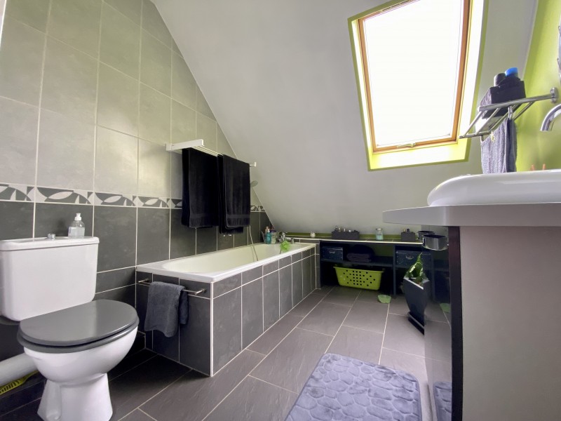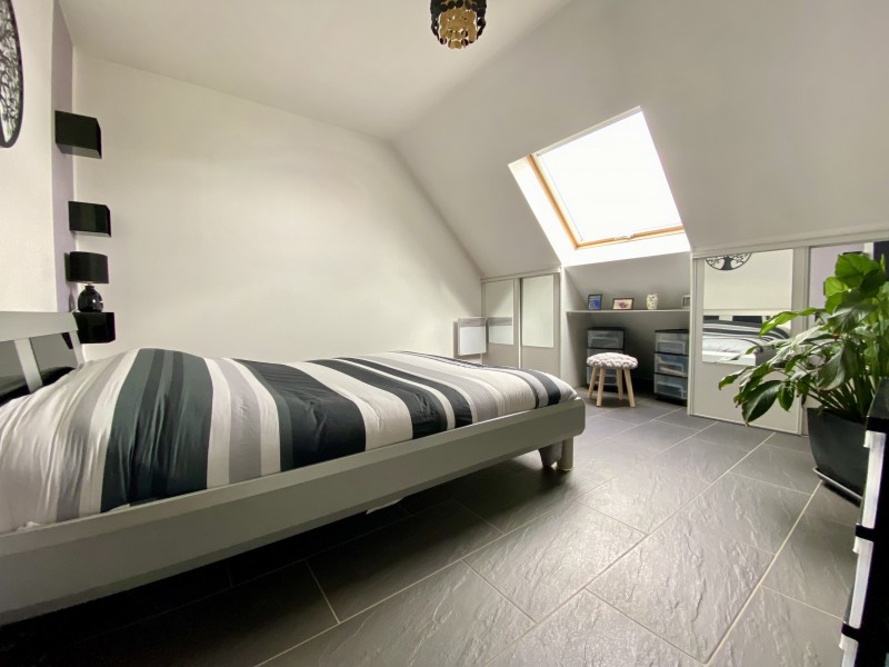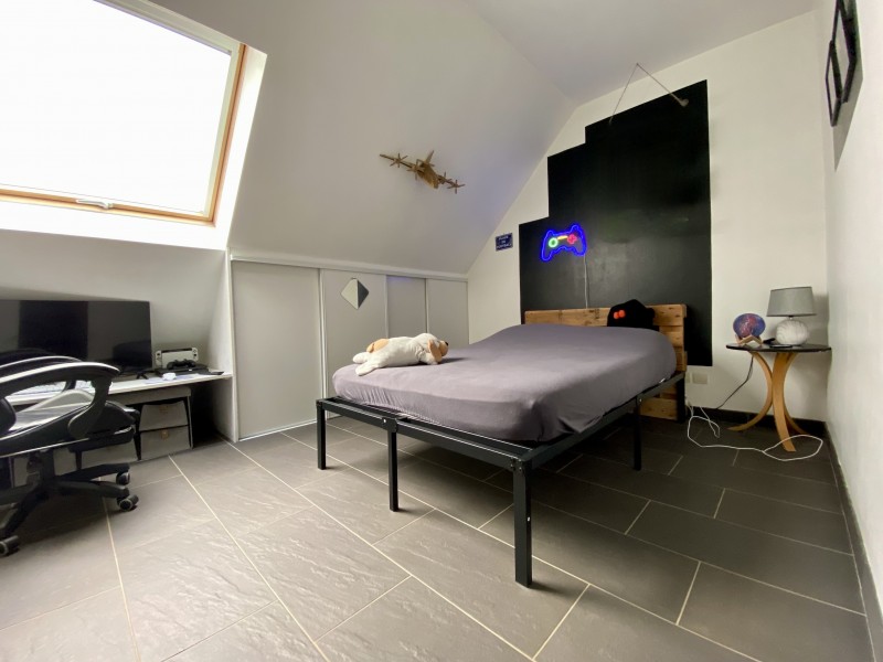 L'étage supérieur abrite deux chambres lumineuses, un bureau ainsi qu'une salle de bain avec WC.