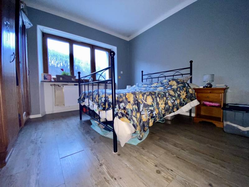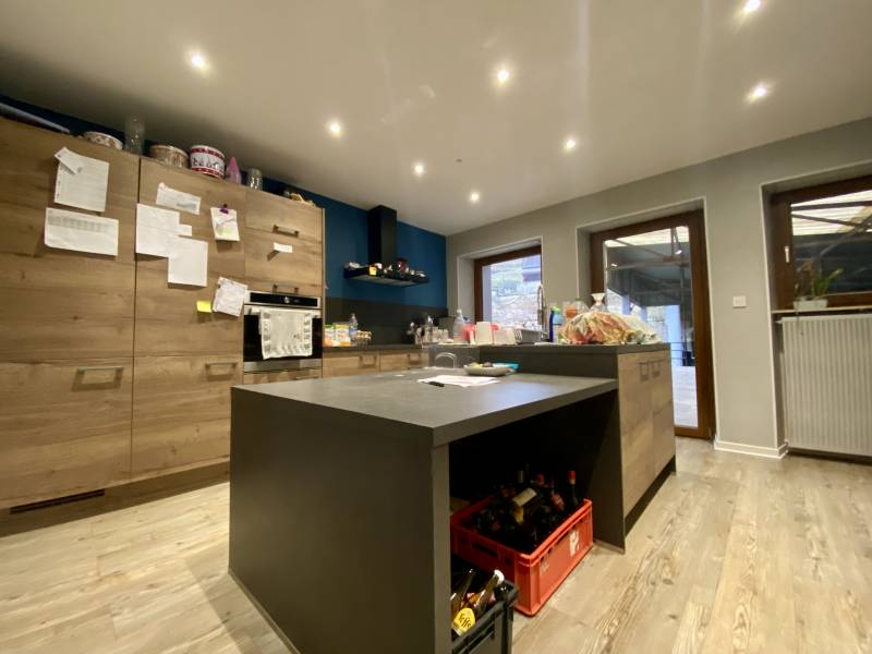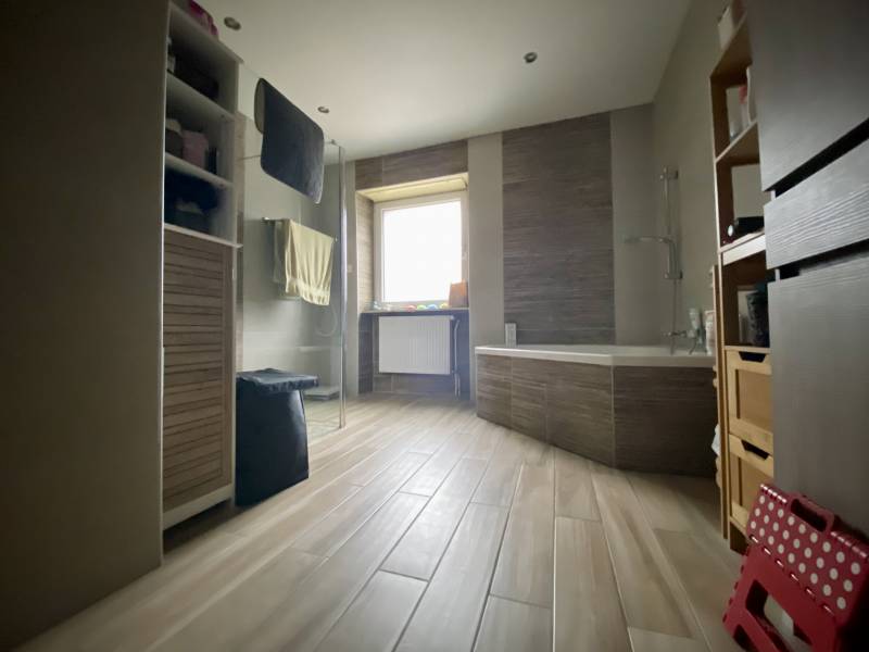 L'étage présente une cuisine équipée, donnant accès à une vaste terrasse couverte, un salon-séjour lumineux, 4 chambres, une salle de bain moderne et un Wc séparé.